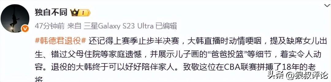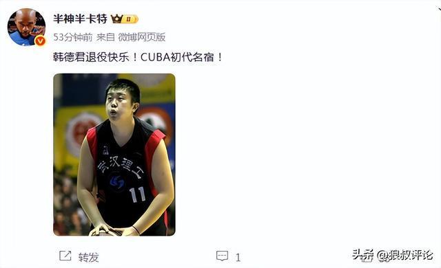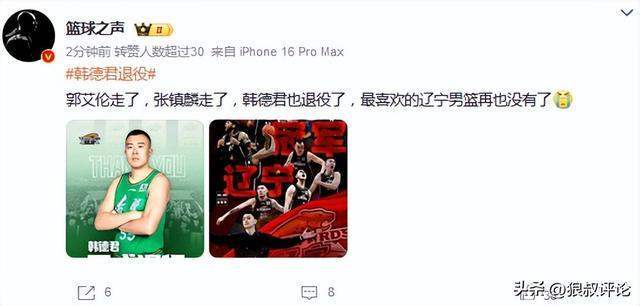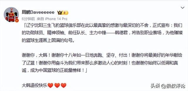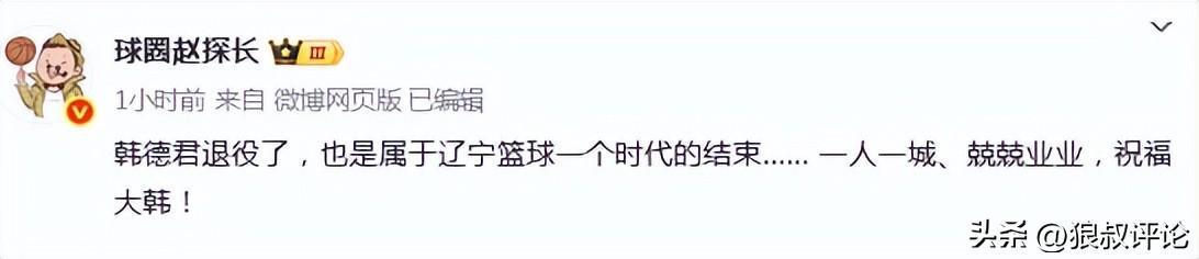 媒体人赵探长发文点评:韩德君退役了,也是属于辽宁篮球一个时代的结束…… 一人一城、兢兢业业,祝福大韩。