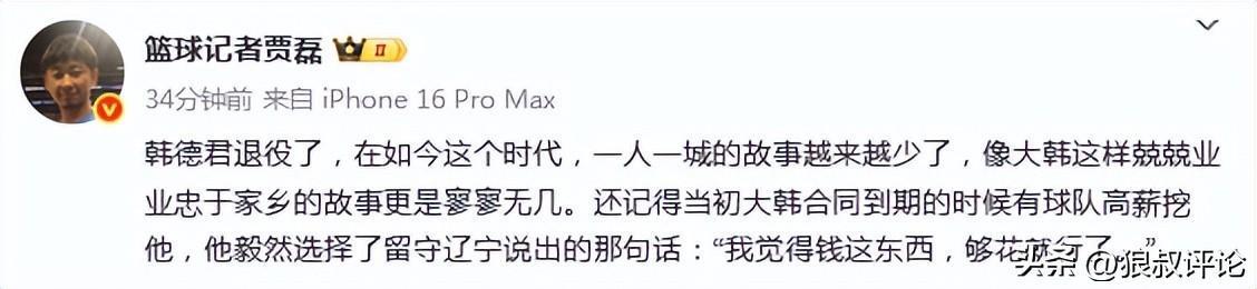 篮球记者贾磊发文点评:韩德君退役了,在如今这个时代,一人一城的故事越来越少了,像大韩这样兢兢业业忠于家乡的故事更是寥寥无几。还记得当初大韩合同到期的时候有球队高薪挖他,他毅然选择了留守辽宁说出的那句话:“我觉得钱这东西,够花就行了。”