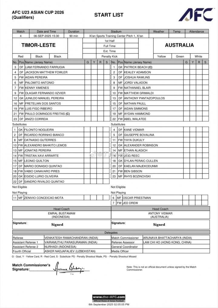 直播吧09月06日讯 U23亚预赛第2轮,东帝汶vs澳大利亚,双方首发出炉。与第一场14-0大胜北马里亚纳群岛的首发阵容相比,澳大利亚进行了7人大轮换。